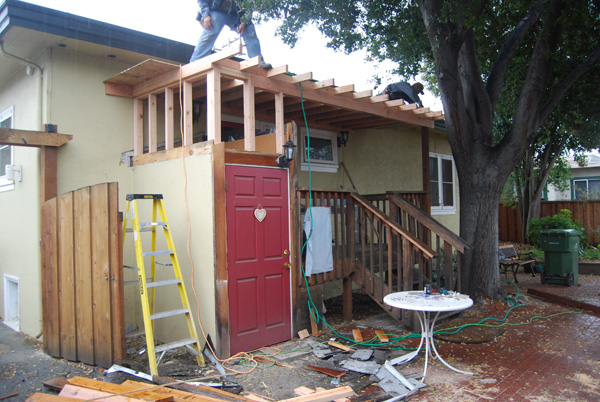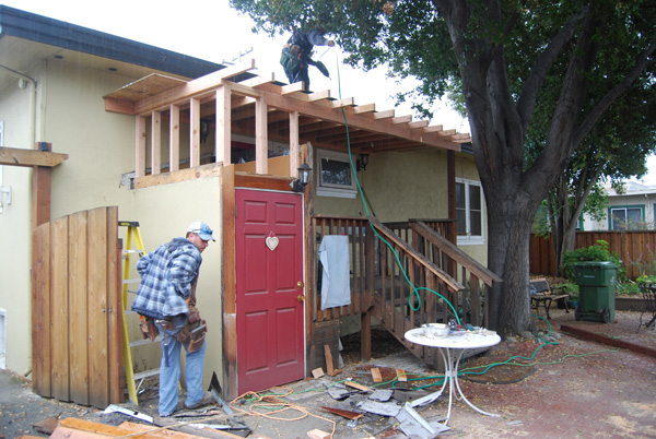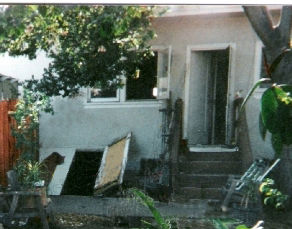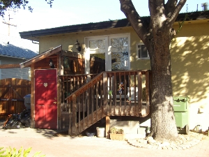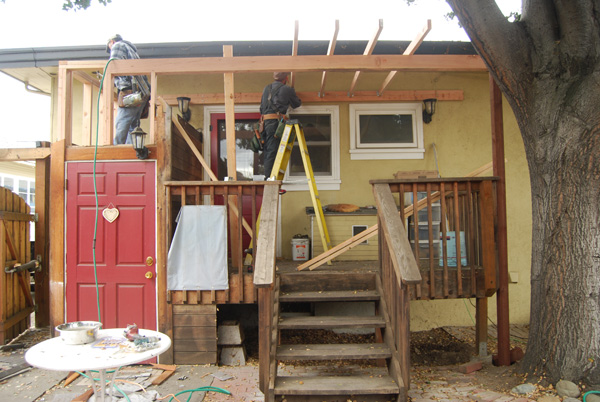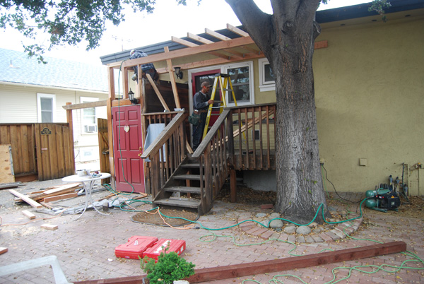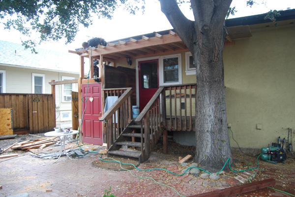 We changed quite a few things. First, the French doors were turned into a door-window combo, then we created a cat box on the back porch accessible through a cat door under the breakfast nook, and in 2008 we reorienting the stairs. This photo shows the latest phase: a roof over the porch and a horizontal roof line that created additional storage space! |