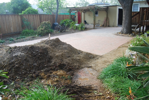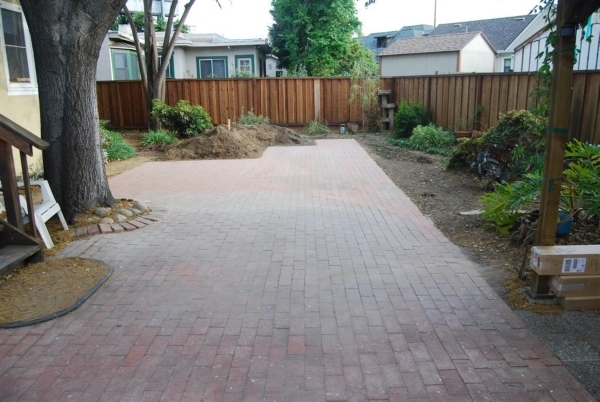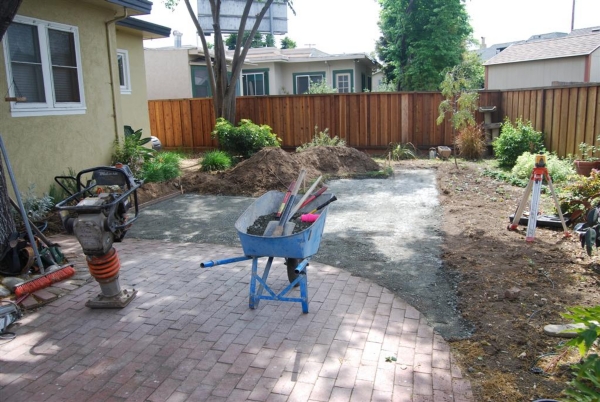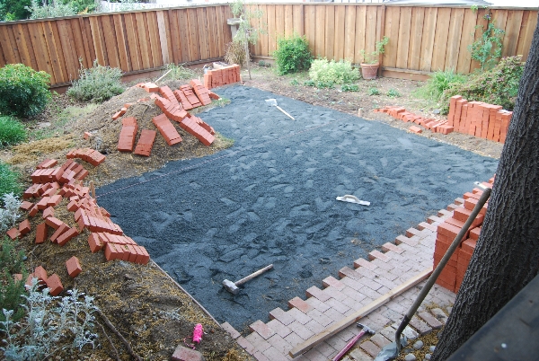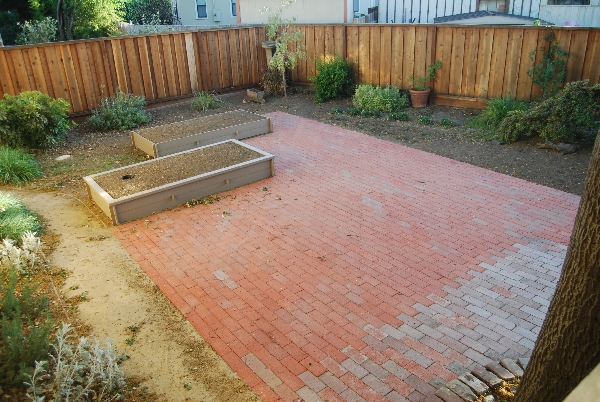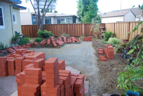 | The workmen dug out another 8 inches of soil (which was piled for later distribution into the planter boxes), lay down and compacted some base rock, and brought in the bricks. | ||