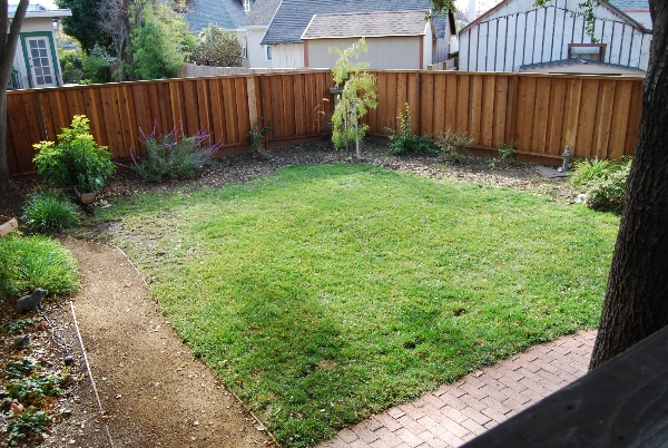 | I had just begun to remove the lawn - by hand! Process: use spade to loosen a section, use a hand trowel to pull up chunks, smash off as much of the dirt as possible for use in the planter boxes (dirt is expensive!), remove the tenacious green plastic mesh still imbedded around the roots and discard. Lather, rinse, repeat! | ||