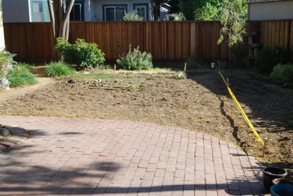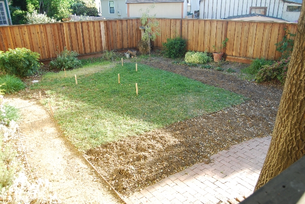 | Grass is gone! Wahooo! [The remaining grass between the two planter beds and will eventually die. The yellow tape is where we want the edge of the patio. | ||