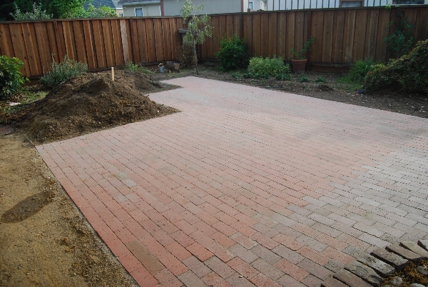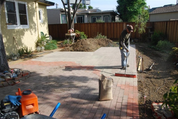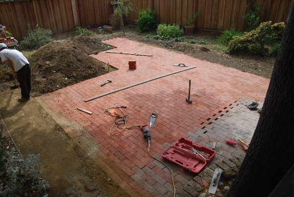 | Bricks are down. The gaps that can be seen will be adjusted by removing bricks in the old patio, moving the bricks apart just a tad to take up the space, and then the entire patio is ready for the sand. | ||