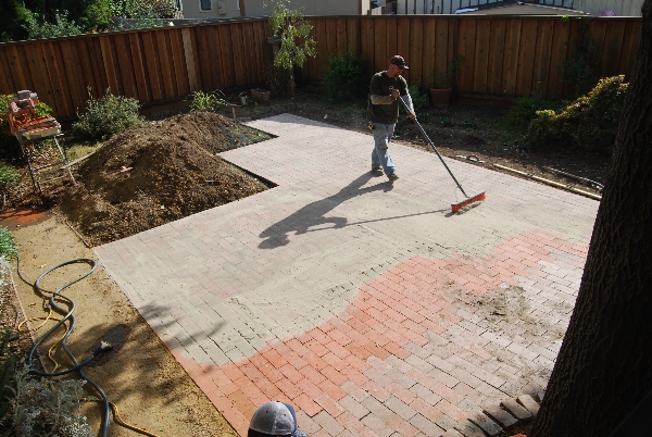 | Sand is pushed over the entire surface to fill in the cracks. This makes the bricks stay in place, but allows water to penetrate. | ||