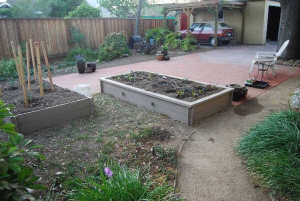 | Next we had planter boxes assembled. They came in a box - preformed boards made from recycled plastic that fit together like Lincoln Logs - very nice design! All the dirt from the old lawn is either in the planter boxes or distributed around the yard on the sides. Ready for plants! | ||