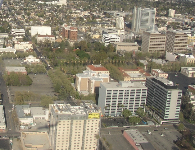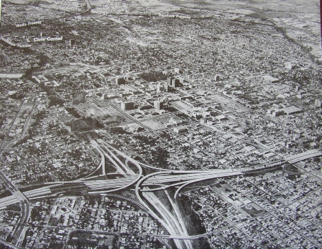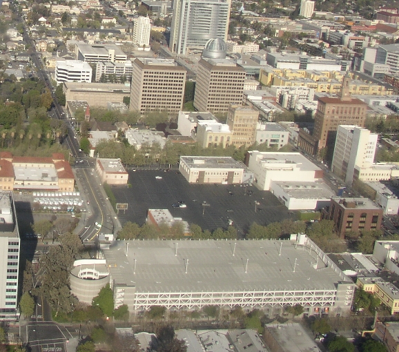 St. James with the Post Office on the far left, the twin towers on Second Street. The Bank of America Building is on the far right. The large black are is the Victory Parking Lot. | ||