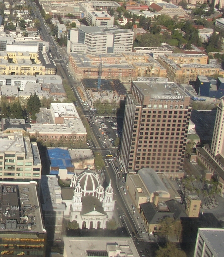 (2008) San Fernando -- St. Joseph's Cathedral, the Knight-Ridder building, with Martin Luther King library and San Jose State University in the background. (2016) San Fernando -- slightly different angle, but you can clearly see St. Joseph's Cathedral and the Knight-Ridder building. |