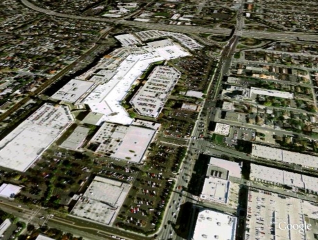 On the left an aerial view of Valley Fair in 1958 seen from approximately Winchester and Stevens Creek, looking east. Old-timers will remember the larger building in the foreground as The Emporium. In the background, an entire separate building, was Macy's. The strip in between? Residences! Nobody dreamed of parking a car at Macy's and *walking* to The Emporium! To the south, it is still orchard -- the old Town & Country Village had not been built yet. You can see Highway 17 (aka 880) in the upper corner. On the right is a GoogleEarth-generated aerial of the area, showing the mall, three parking structures, and Santana Row across the street on the south. On the upper edge you can see the interchange of Steven Creek/San Carlos and Highway 17. This comparison works pretty well, but other comparisons I've tried just don't. The Google-Earth version is an extrapolation, not a real photograph so you can't quite get the angle. The buildings are flattened. Also, you can't get really close aerials. This will do for now, until I can actually get up in an airplane. One more GoogleEarth-generated shot: |