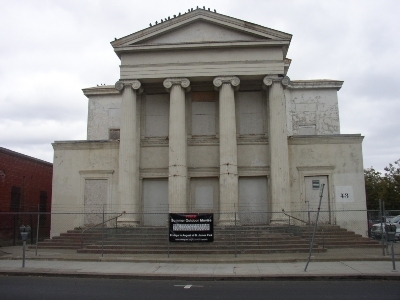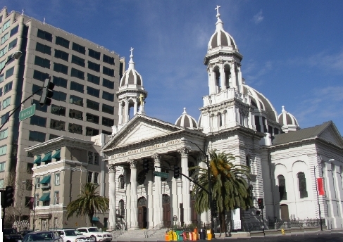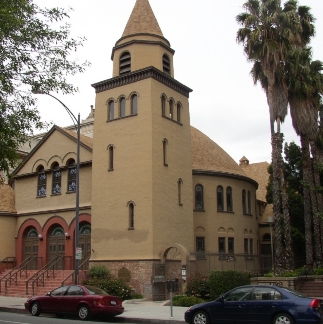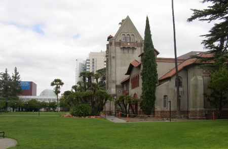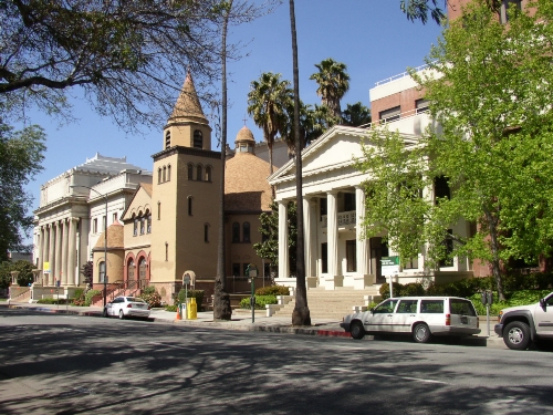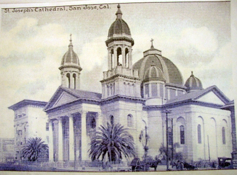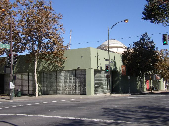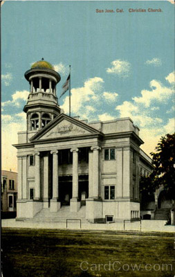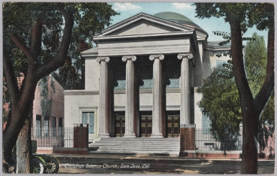 On the left is a postcard of the original Christian Science Church on St. James Street between First and Second Streets where it overlooks St. James Park. It was built in 1902-1904 and used as a church until 1946. It was used for a while as a theater but has been boarded up and unused for decades. The Preservation Action Council of San Jose is monitoring the building and working with the owner to find an economically feasible solution to allow its preservation. (SJHM) | |