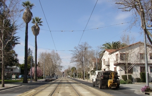 First Street, near the intersection with Hensley Street, looking north (mid-1930s). Ironically, the old trolley lines were removed and paved over in the 1940s. When the modern light rail went in, new track had to be laid. (SJHM) Want to read more about San Jose's streetcars? | |