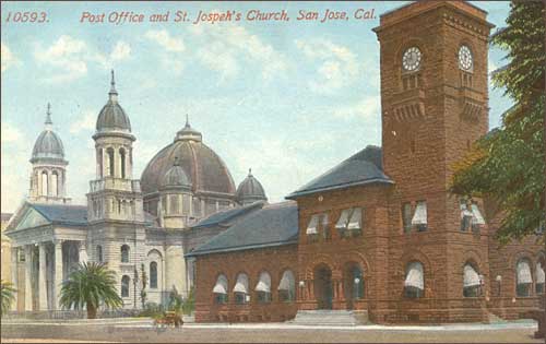 South Market Street, looking at St. Joseph's Cathedral and what was then the Post Office, later the San Jose Public Library, and now the San Jose Museum of Art. The shot on the left appeared on a post card in the 1930s and is probably an artist's rendition rather than a photograph. (SJHM) |