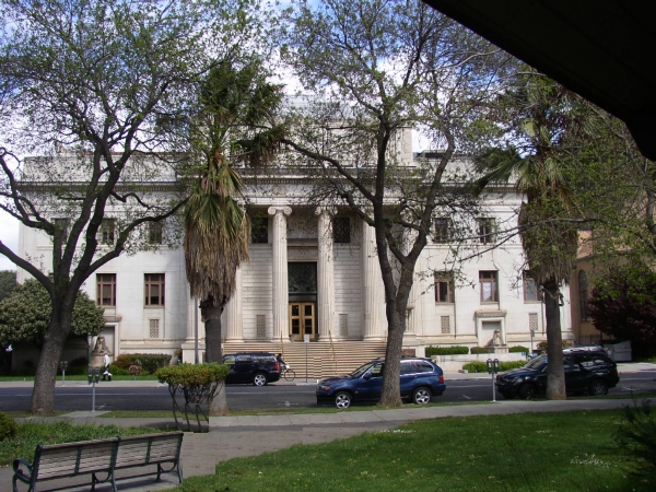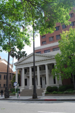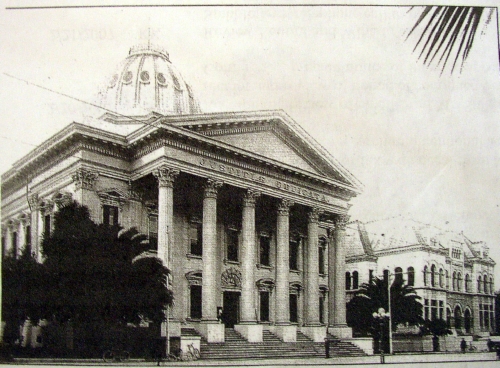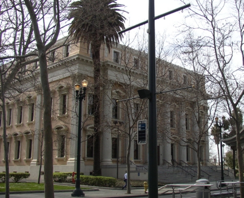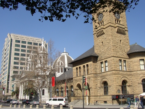 The Santa Clara County Courthouse - the old one - was built in 1867 at a cost of $200,000. The building on the right in the old photo is the Hall of Records that was demolished in 1962 to make way for the new courthouse at 191 North First Street. This old one is at 161 North First Street and now houses the court's administrative offices. The old courthouse originally had a dome and had a single courtroom. Later it was divided into three courtrooms and the dome was lost in a fire in 1931. The photo on the left is from 1895; the one on the right was taken in 2007. |