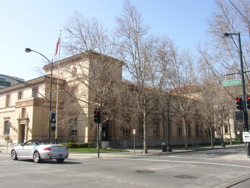 The same building, but this time comparing an actual photograph taken in 1910 with one taken in 2007. Once the Post Office, later the San Jose Public Library, it is now the San Jose Art Museum. The Knight-Ridder building looms in the background on the right and you can see the extension of the museum on the right. | |