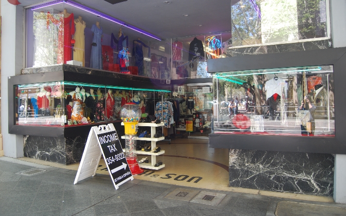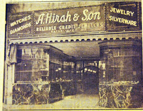 You might not recognize this store front at 19 South First Street (a jewerly store in the 1920s) were it not for the marbled tile front. The photo on the left was part of the advertisement the company used for many years in the San Jose City Directories beginning in 1927. At some point after the first photo was taken, the words "A. Hirsch & Son" was worked into a mosaic tile entry way, which is what is says today, even though the business is now "Hammer & Lewis Fashions." | |