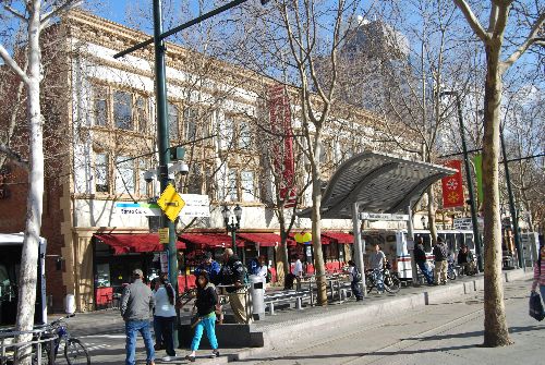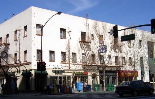 Back at the turn of the 20th century, three men owned three adjacent pieces of property on Second Street, just south of Santa Clara. Wenger, Knapp and Clark hired the architectural firm of Wolfe & McKenzie to build this large building on the three lots. It was two levels, with 26 apartments built over six 8,900 square foot stores, plus a full basement. The building was later the Jose Hotel. In 1995-1996, the upper floors became condominiums and the ground floor became Zanotto's grocery store. And of course the light rail runs down the middle of the street now. | |