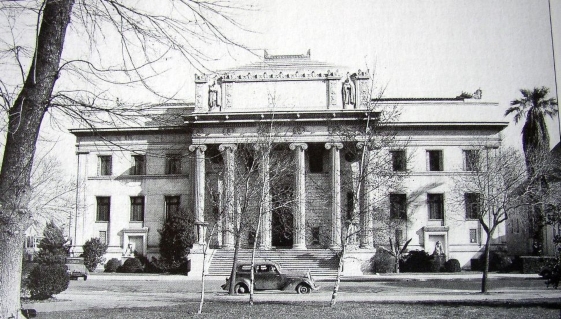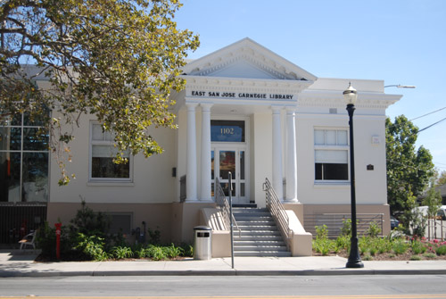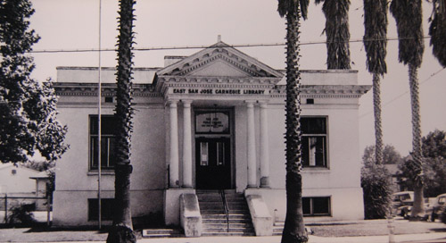 The Carnegie Library at 23rd and East Santa Clara opened in 1907 as the first branch library in the San Jose Library System. It went through several renovations over the decades and got a major facelift and expansion in 2008-2009. The addition wraps around the back side, which makes the front look pretty much as it did in the 1950s when the photo on the left was taken.. It was part of an exhibit at the Martin Luther King Library celebrating the remodeling. | |
