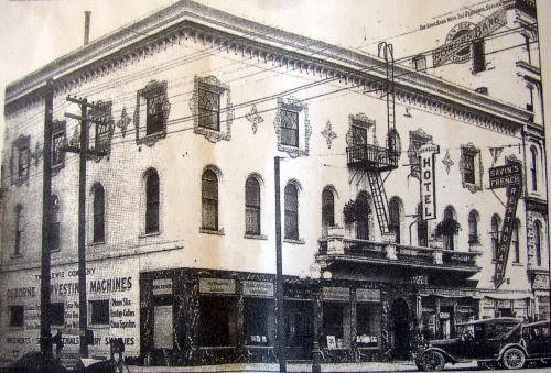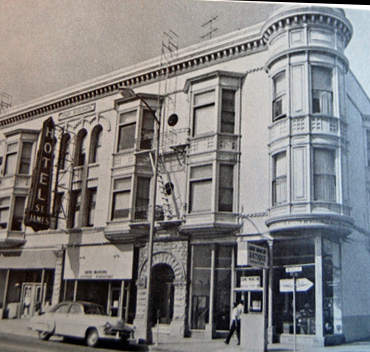 The Hotel St. James is just one block north of the County Courthouse. It was originally called the Straford Hotel and once boasted luxurious corner suites with 10-foot high pocket doors. It was renamed the Hotel St. James when the original Hotel St. James up the street was demolished in the 1930s. The hotel was later converted to a rooming house and the pocket doors vanished behind sheetrock and plywood. When a group of San Jose attorneys decided to renovate the old hotel and use it as their law office, they uncovered the pocket doors which still function. The photo on the left is from the 1960s; the one on the right from 2009. | |