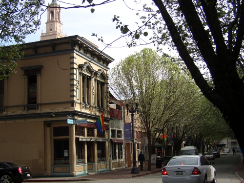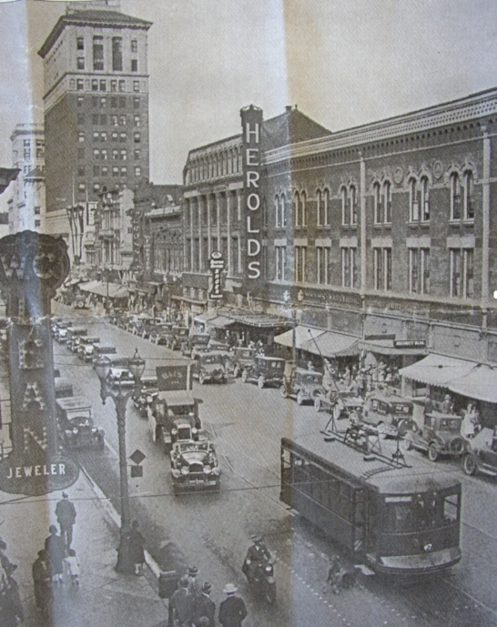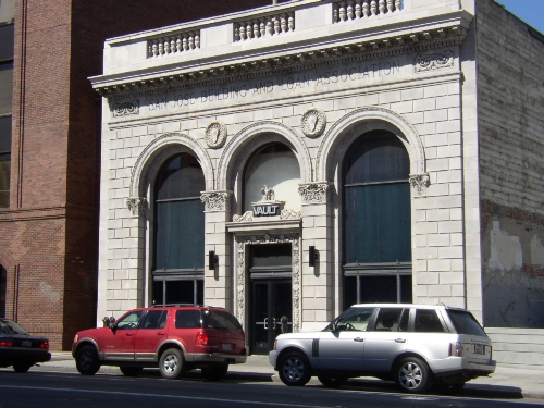 This building is just west of the old Christian Science Church above. You can see its dome rising in the background. The original structure dates from the 1880 when Clarence Letcher sold his own manufactured cars here. It was a garage for many years. but had undergone some serious remodeling before it became The Oasis nightclub for a few years. Obituary: In 2010, this building was demolished, perhaps to provide a parking lot for the building next door. | |
