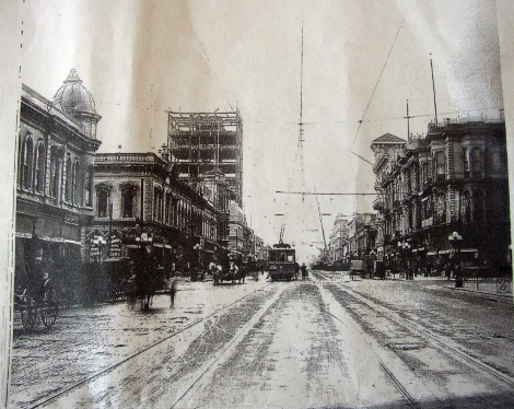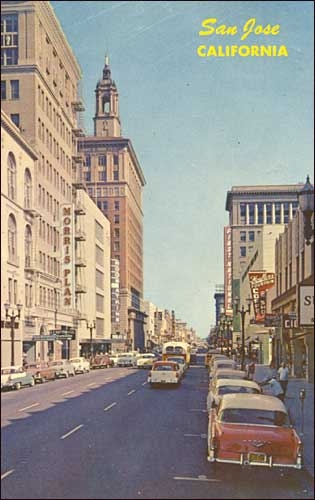 The only way I could tell this was the same photo is the dome on the left -- it's Santa Clara Street, looking west, from Third Street. The photo on the left is dated 1910. The building in the distance that is under construction is the old First National Bank building on the southwest corner of First and Santa Clara, not the Bank of America building that looms in the background of the photo on the right, which is on the southeast corner. The nine-story First National Bank building was started in 1909. In the early 1960s the building underwent a facelift that included covering the original brick with sheets of marble and glass. The current owners do not appear to be interested in uncovering the original structure (sigh!). (SJHD) | |