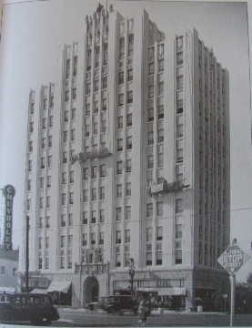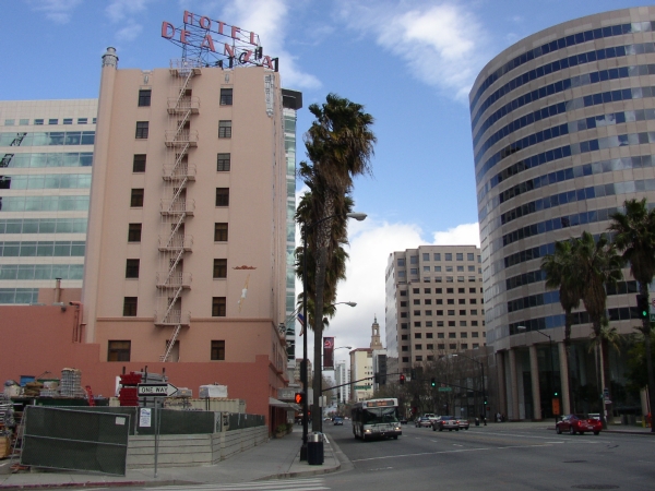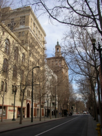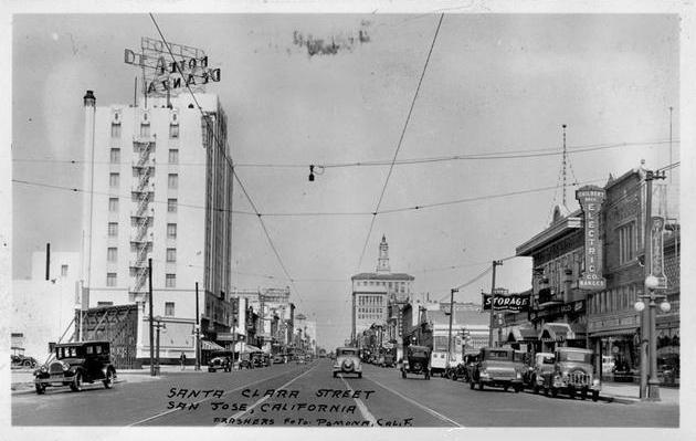 Looking east on Santa Clara Street at the De Anza Hotel. The photo on the left is from the 1930s. The tower of the Bank of Italy Building in the distance is still visible in the second photo. The angle is a bit off, but I couldn't stand in the middle of the street to take the photo. Thanks to Sandy Ragsdale for contributing the old photo. | |
