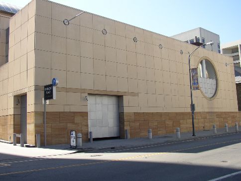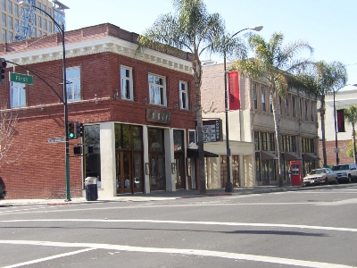 Some buildings, of course, do not survive. The block of building on the left (photo taken in the 1950s) housed retail stores on the south side of San Fernando between First and Market. The building on the right is the back of the new wing of the San Jose Art Museum. If the building were not quite as tall, you could see the two towers of the old wing of the San Jose Art Museum that are visible in the left photo. | |