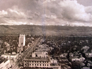 I am indebted to Otto Lee of the Intellectual Property Law Group who has offices on the 12th Floor of the Bank of America Building at First and Santa Clara, for letting me into his office to take this photo. The angle is not exactly the same, but you can see the dramatic growth in downtown east of First Street. San Jose City Hall has transformed the view; Santa Clara Street is now edged with trees. A few buildings still remain, such as the Medico Dental building. San Jose Hospital in the far distance on the righthand photo is empty and will soon come down. (SJCWP) | |