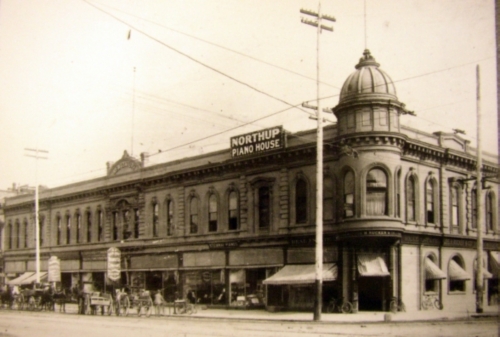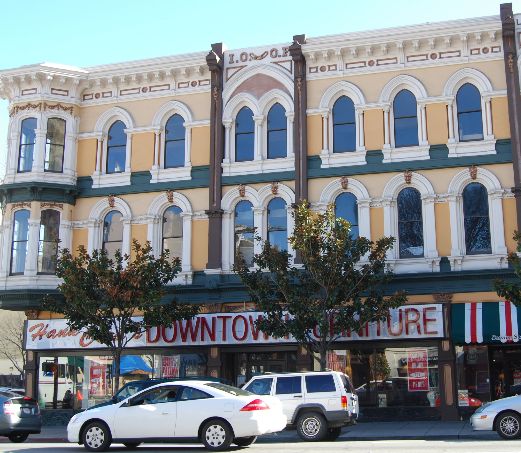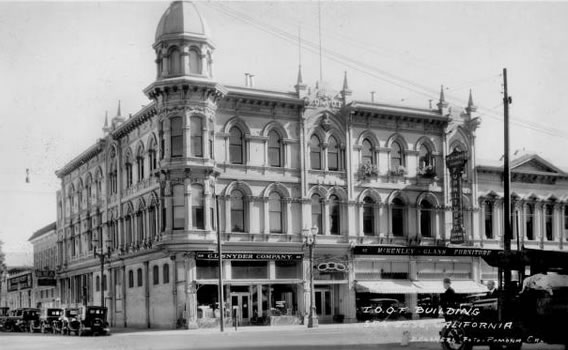 This is the building on the southwest corner of Third and Santa Clara, where Hank Coca's Downtown Furniture store is today. Mr. Coca was kind enough to let me into the third floor of his building to take the photo just above these showing the view of Fourth Street where freight trains used to run. The photo on the left is from the 1920s and courtesy of Melissa L, who sent it to me from the Pomona Public Library. The Oddfellows owned it at the time the photo on the left was taken and you can see the letters IOOF in the photo on the right. The building has been changed a lot -- the top of the tower seems to have been removed along with a lot of decorative pieces -- but the building has survived the decades. [Note to self: I need to go back out and get a photo from the corner to better match the photo on the left.] | |