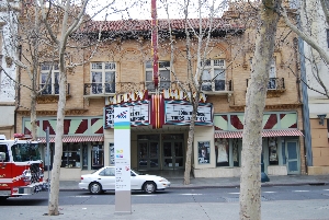 The Montgomery Theater at the corner of Market and San Carlos was built in the 1930s and the photo on the left was taken in 1936 . The trees have grown, but little else about the site has changed in over 60 years. I thought about trying to take the photo again in the winter when the trees have lots their leaves but, as you can see, most of them are palms and evergreens. | |