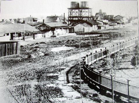 It's hard to believe this is the same curve. It's hard to believe the curve is still there! That's the north end of the park that splits Market Street south of San Fernando. The photo on the left was taken in 1866 and most of what you see was then Chinatown with a brewery looming behind the then-new water tower. Now the site holds the Fairmont Hotel. (SJHD) | |