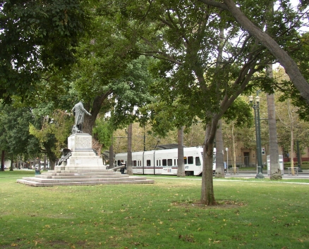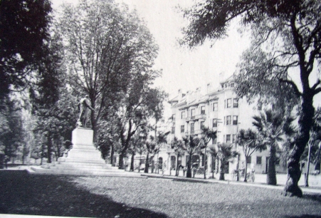 While we're at the park, here are two photos of the McKinley statue. The buildings in the background on the left are NOT behind the trees in the second photo -- they were replaced by the Post Office (above), which you can't see because of the trees. (SJHD) | |