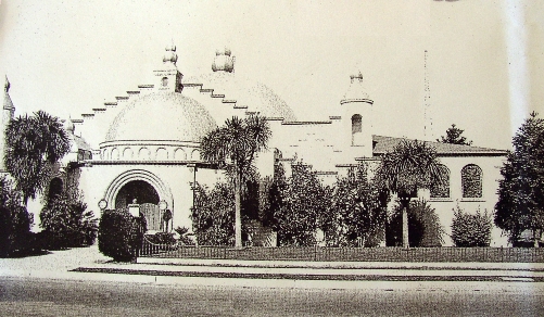 Just north of the Unitarian Church is the Scottish Rites Temple (left, circa 1930), now the home of the San Jose Athletic Club. Third Street was once a two-way street there, but is now a one-way street running north as far a Julian, where it is a two-way street again. Triva buffs: Back in 1997, John Travolta and Dustin Hoffman, made a movie about a hostage held in a museum. The exterior of the museum was played by this building! Look closely at the large blank space above the six columns in front and you can make out the ghostly remains of the lettering "Taylor County Museum of Natural History."(SJHD) | |