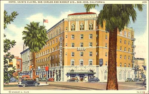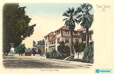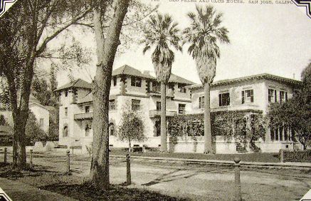 The Sainte Claire Club was built in 1893 as a meeting place for San Jose businessmen. The road appears to be gravel or dirt and those appear to be hitching posts(!) in the foreground!. The building on the right is now a parking lot and the palm trees have grown out of sight. The tree in the middle of the photo on the left is gone but, judging from the split trunk, the tree on the far left is the same tree. | |