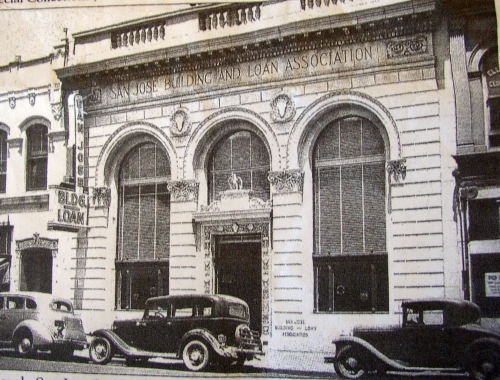 The San Jose Building and Loan Association on Santa Clara between First Street and Market Street, was built in 1927. The photo on the left was taken in the 1940s. In 2007 it's the "Vault Ultra Lounge." (SJHD) | |
