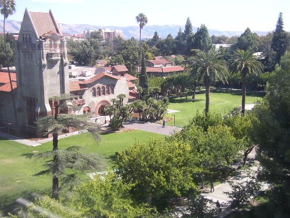 Another view of the San Jose State Tower. The photo on the right was taken from the fifth floor of the Martin Luther King Library. The covered walkways are gone and you can see the new dorms rising in the background. | |