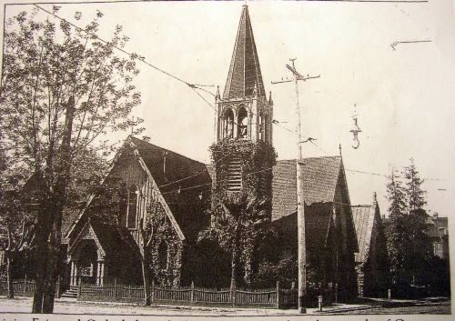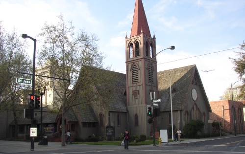 Trinity Episcopal Church (built 1863) is a wonderful example of Carpenter architecture. It's at the corner of Second Street and St. John. An undated photo on the left and one from 2007. This church originally faced St. James Park but during its first expansion in 1873, it was cut in half and turned to face Second Street. (SJHD) | |