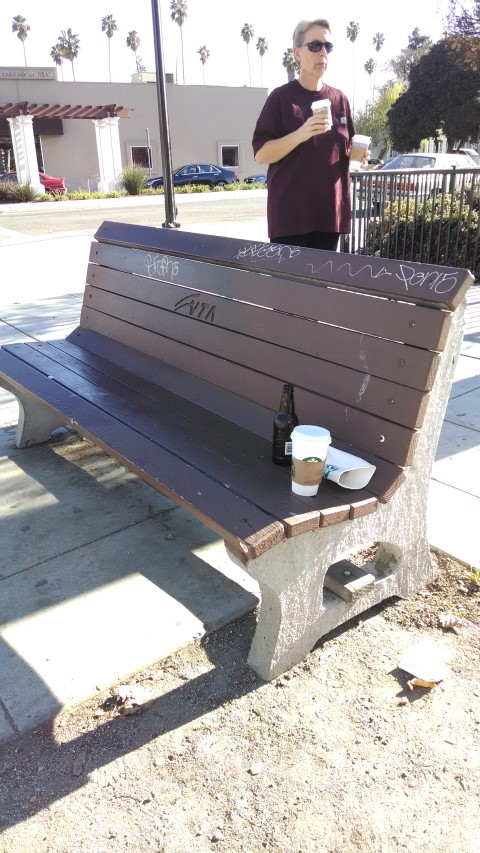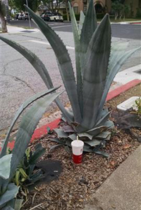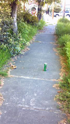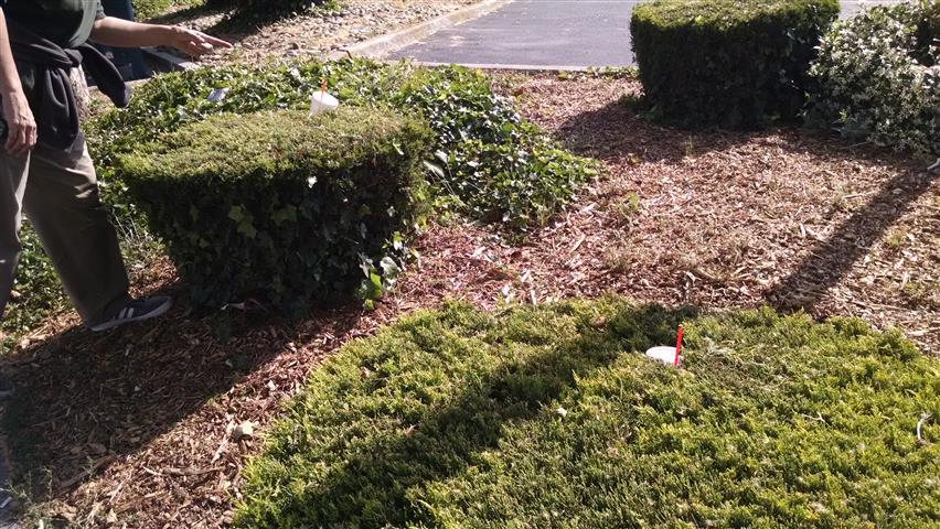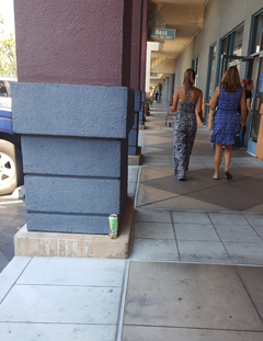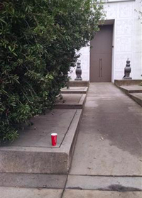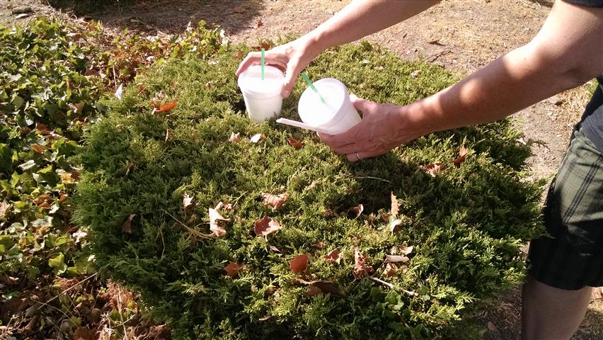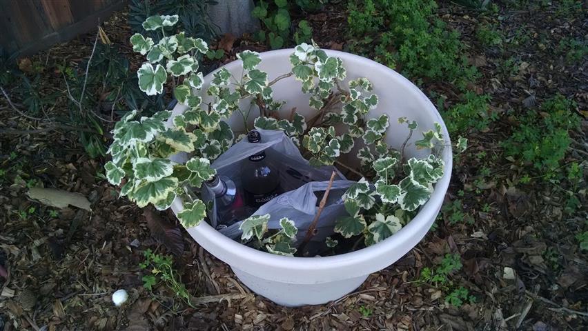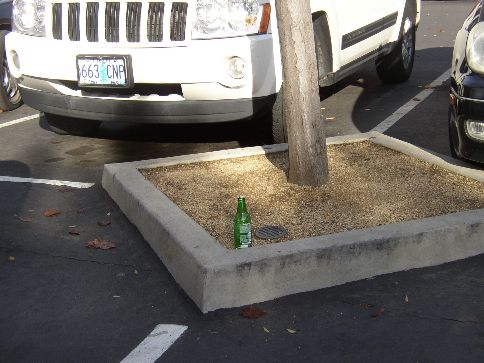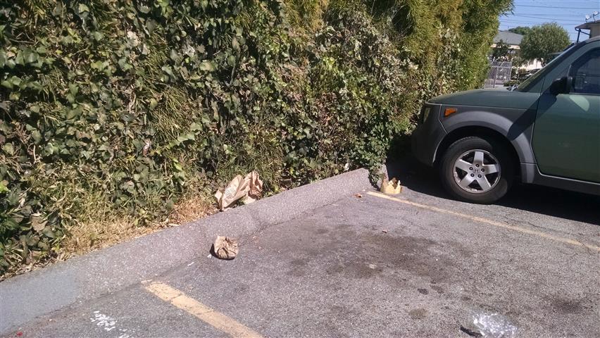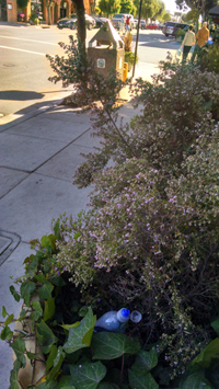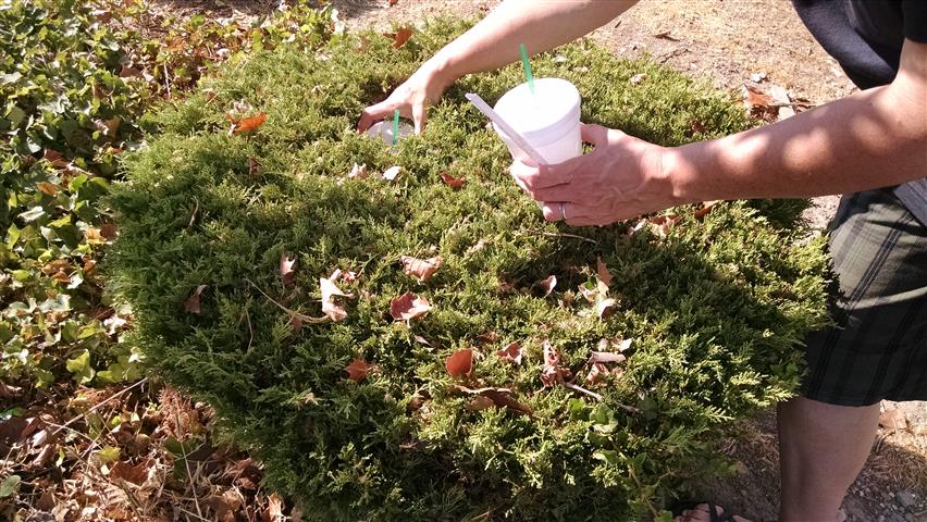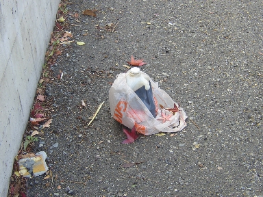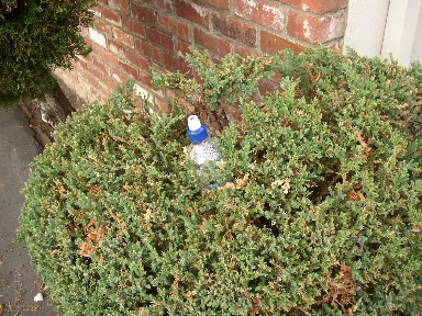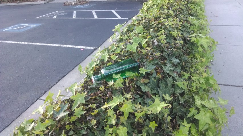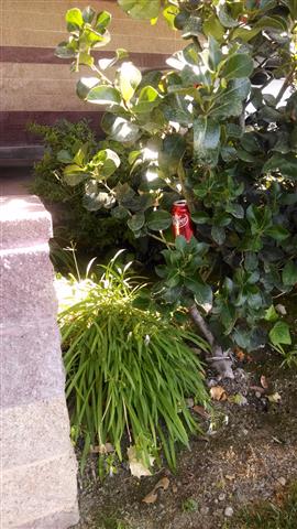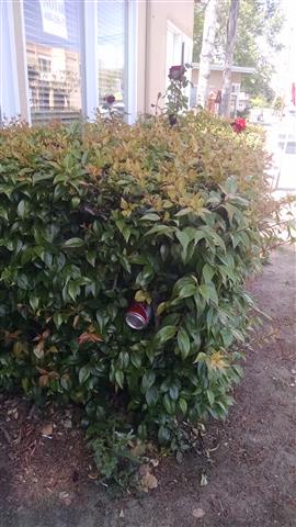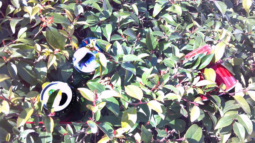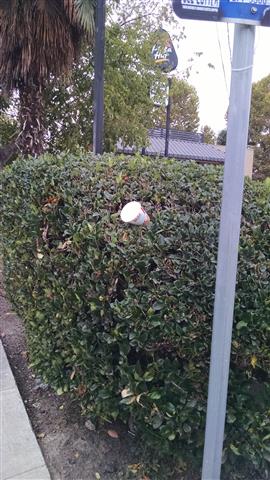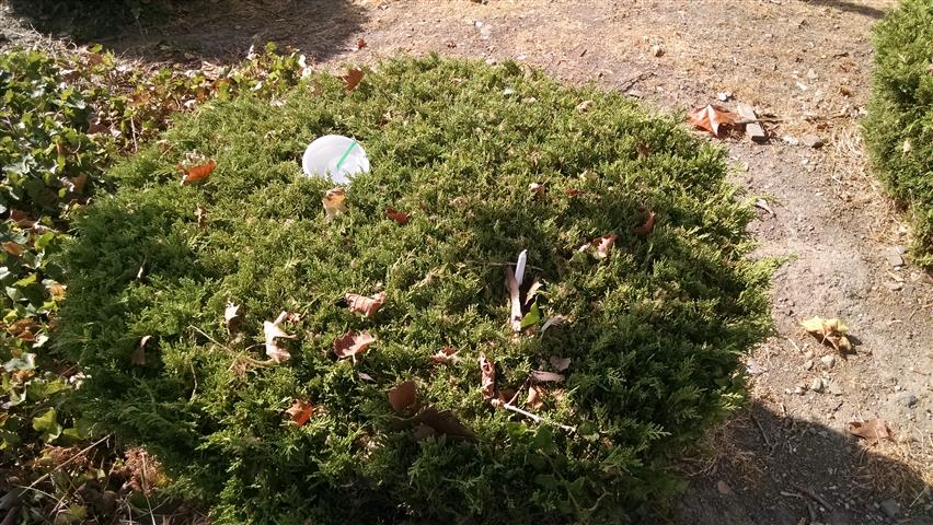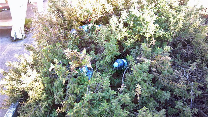 Cup right there on top of the bush! | Tucked into the bush... | See the bottle? See the trash can ahead? | ||