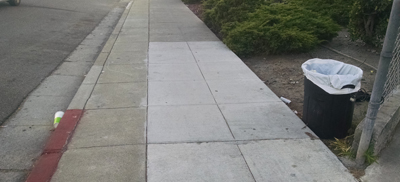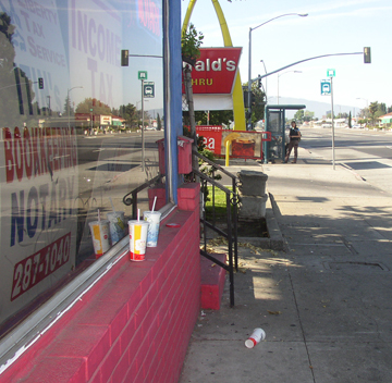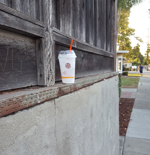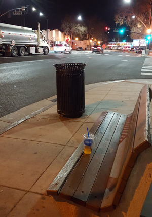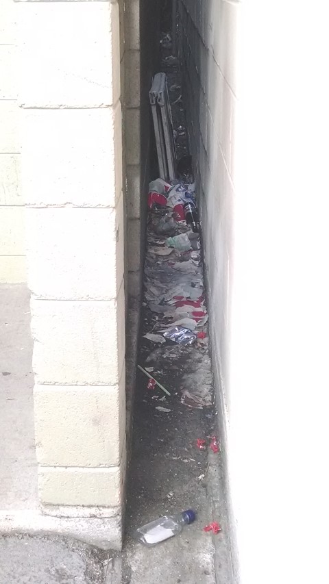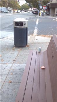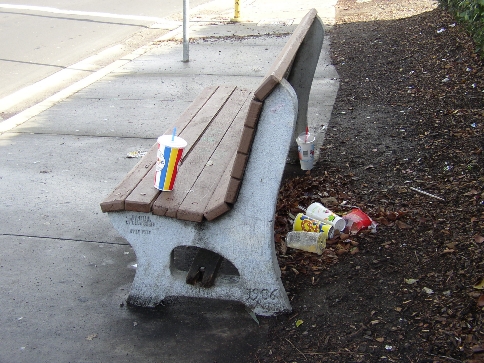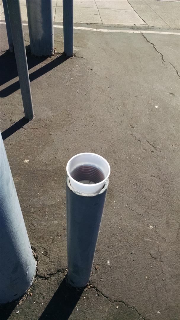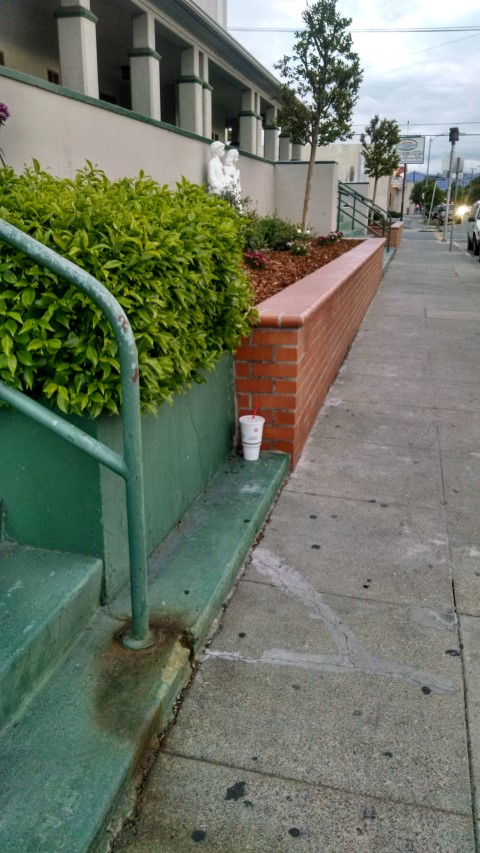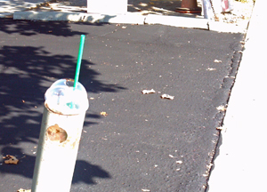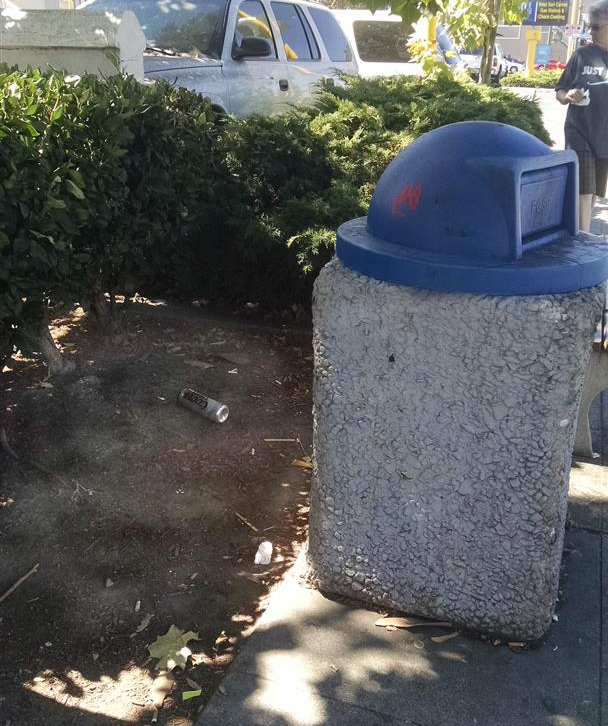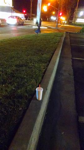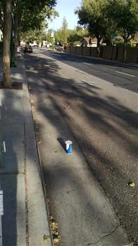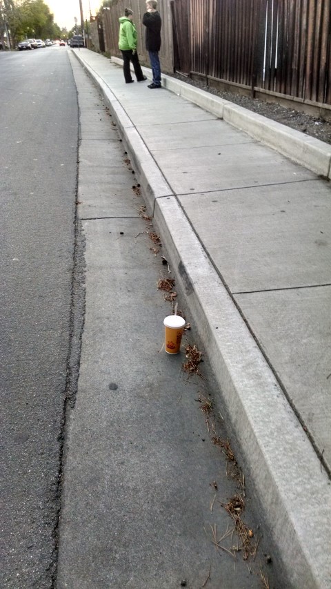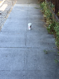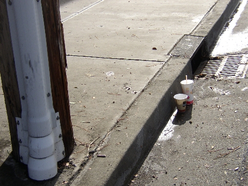 Cup on the left in the gutter - trash can on the right. |