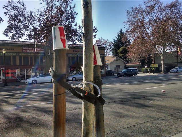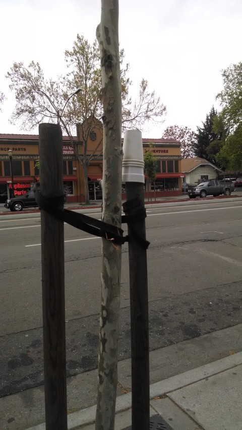 Cup stuck on the poles supporting a young tree |