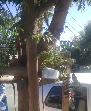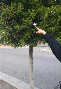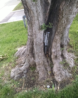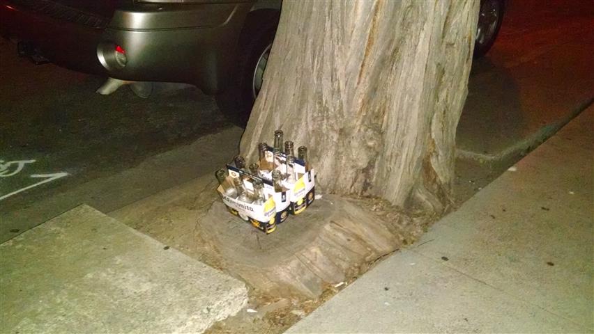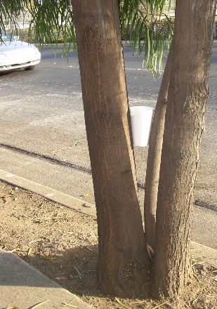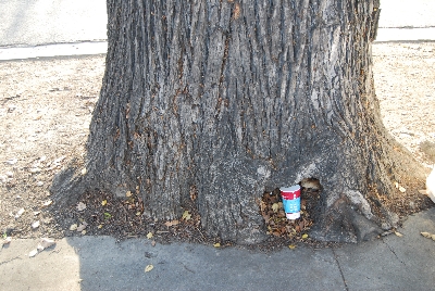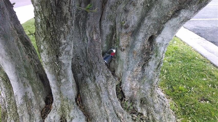 A cup carefully stuck in a tree in the "V" of this tree | A bottle upside down in the "V" of this tree | This time it's a soda can tucked in the "V" of the sametree | ||