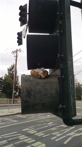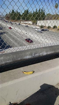 Trash in the gap between two buildings. | The leftovers from lunch stuffed between the lights in a stoplight. | Banana peel on an overpass. | ||