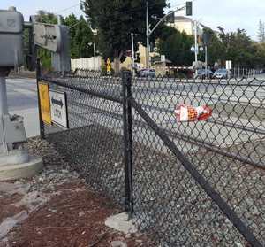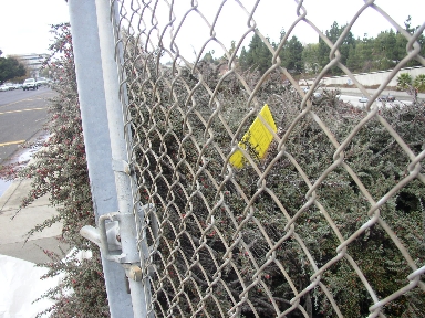 A sign tossed behind a chain link fence so nobody can remove it |