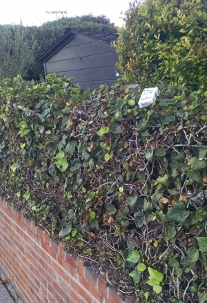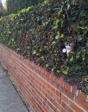 Same hedge.... two different days. A cup and...an empty cigarette pack.